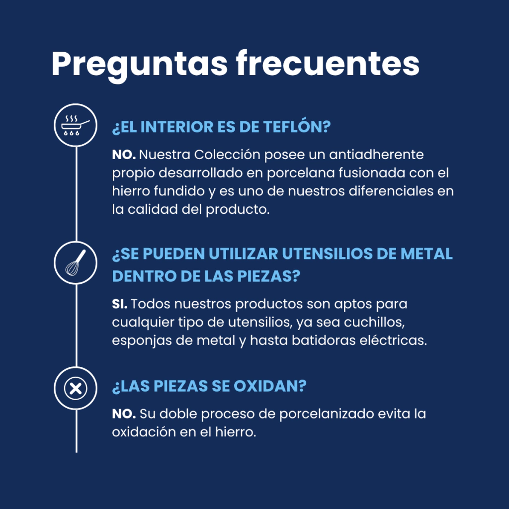 - Cuida tu salud: La cocción en piezas de hierro fundido esmaltado preserva las virtudes de los alimentos, todos sus nutrientes y el verdadero sabor de las comidas. Nuestras piezas son libres de tóxicos. No utilizamos Teflon, aluminio, ni otros metales pesados.