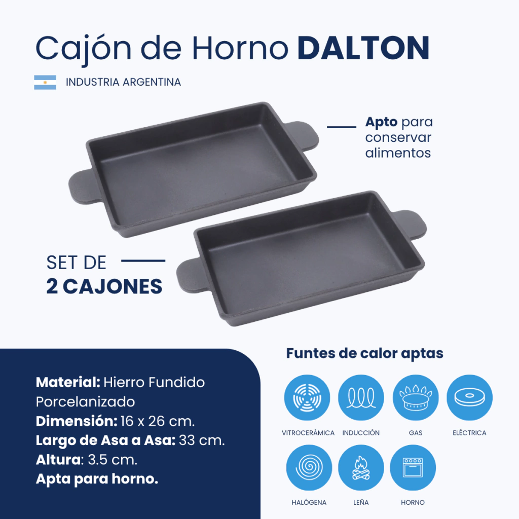 El Set Dalton es tu mejor aliado para cocinar con estilo rústico. Pensado para su uso en brasas, horno de barro, parrilla o en tu cocina, este cajón de horno mantiene la temperatura, sabor y nutrientes de tus preparaciones. Con Dalton podes cocinar, servir y comer directamente en la pieza, sorprendiendo a tus invitados.